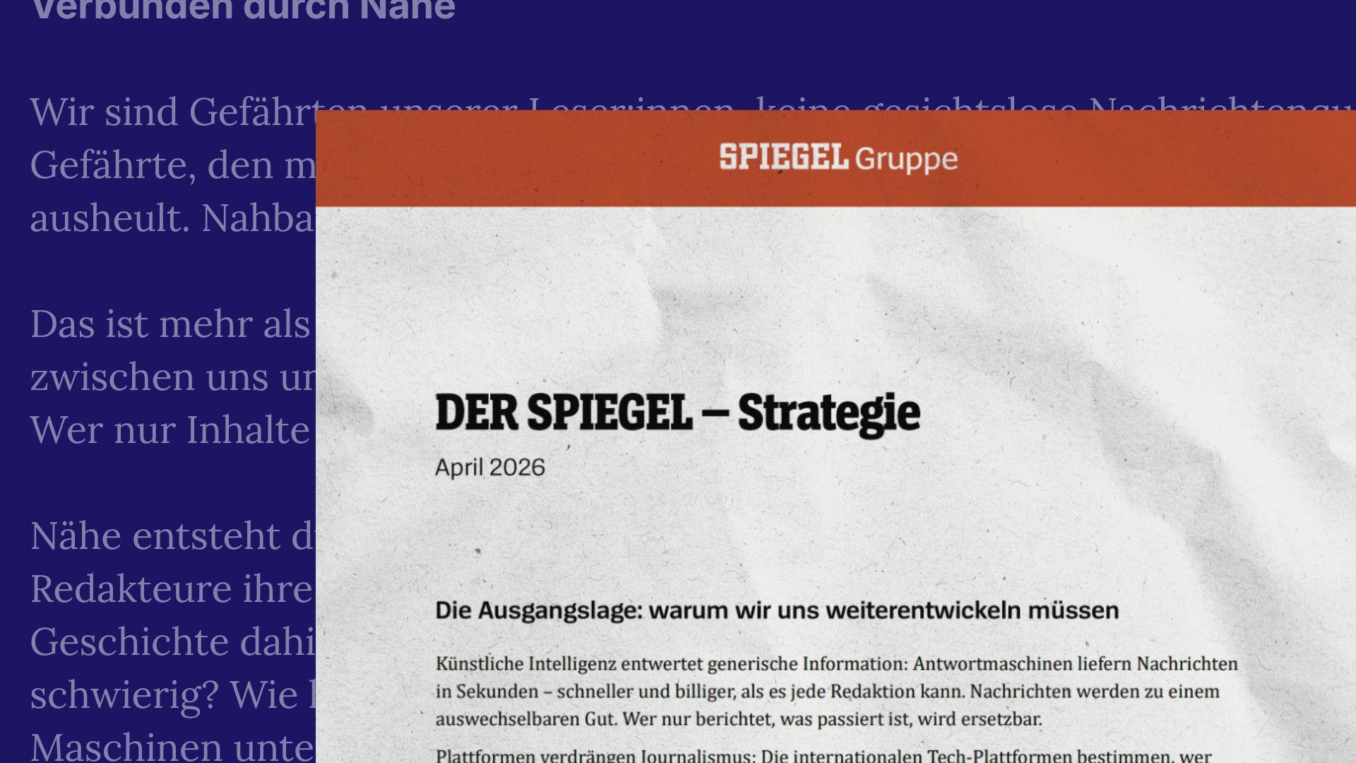 Apropos: Auch wenn die Übernahme der Extra-Idee für manchen beim Spiegel ein Grund zur Freude sein kann, ist das Magazin längst kein Trendsetter. In vielen Bereichen hinkt man mittlerweile ganz schön hinterher. Dieser Eindruck lässt sich auch aus dem jüngsten Strategiepapier gewinnen. Erst vor wenigen Wochen hat es die neue Geschäftsführung intern präsentiert. Medieninsider liegt es vor und erklärt, warum es vorerst mehr Fragen als Antworten liefert.